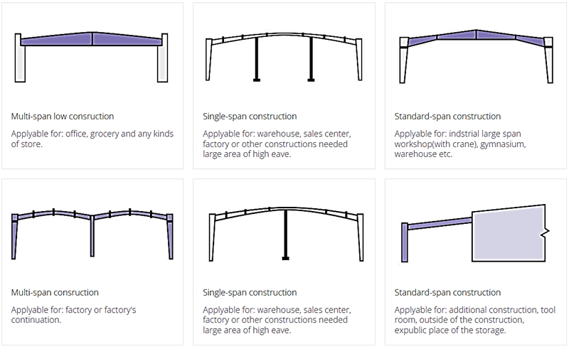 We can provide the following commonly used general steel structure building types according to different sizes and spans required by customers: single-span construction、multi-span consruction、high and low span consruction、standard-span construction.